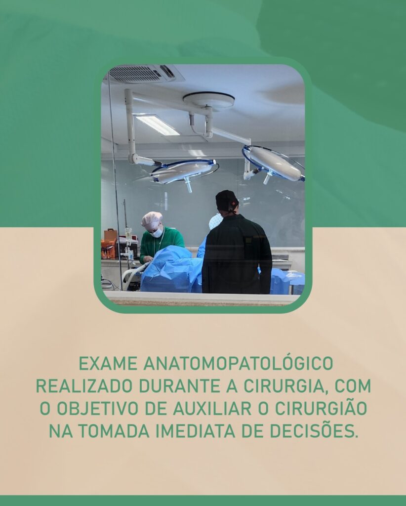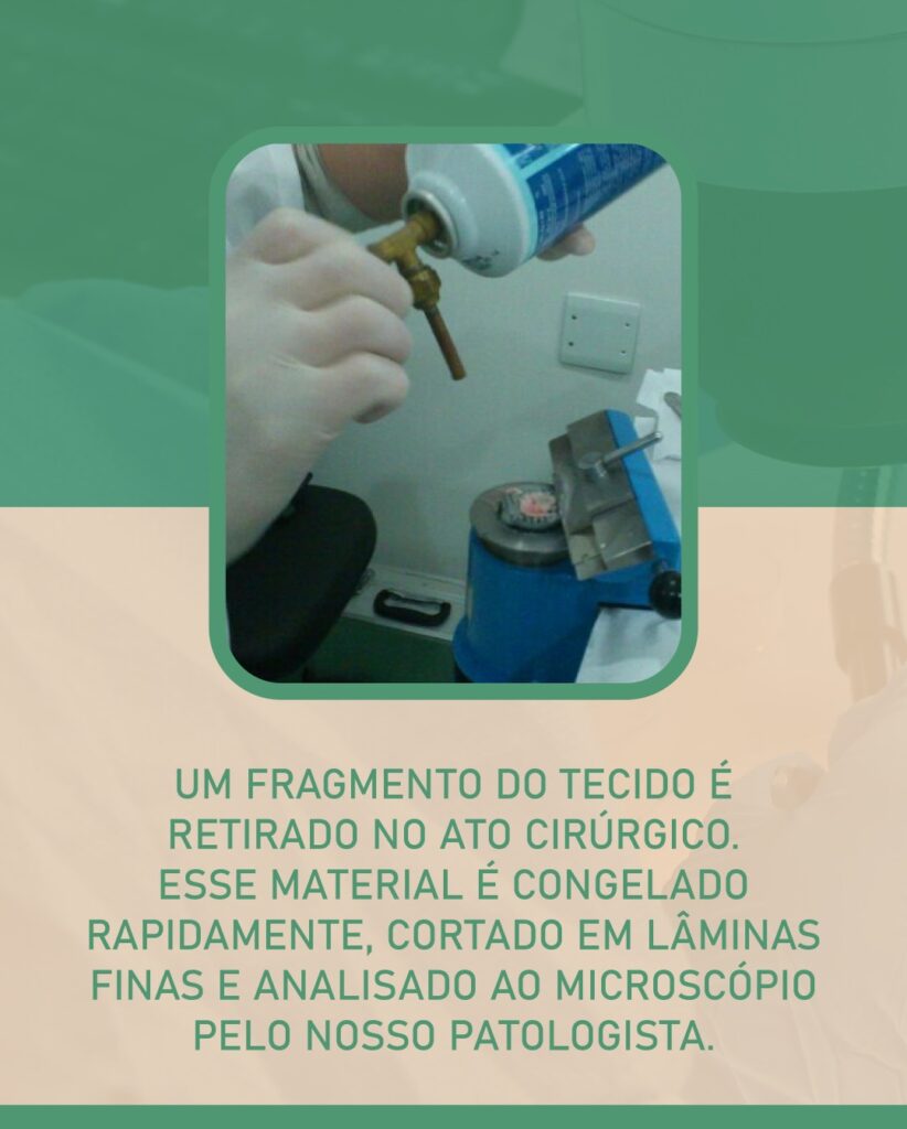 Um fragmento do tecido é retirado no ato cirúrgico. Esse material é congelado rapidamente, cortado em lâminas finas e analisado ao microscópio pelo nosso patologista. O resultado costuma sair em 10 a 20 minutos, ainda com o paciente em cirurgia.