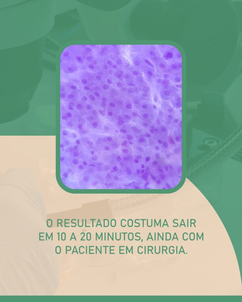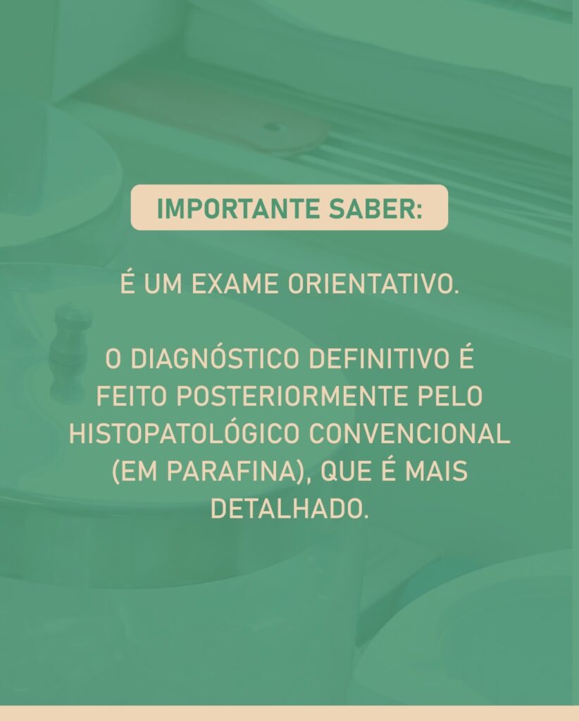 Importante saber: É um exame orientativo. O diagnóstico definitivo é feito posteriormente pelo histopatológico convencional (em parafina), que é mais detalhado.